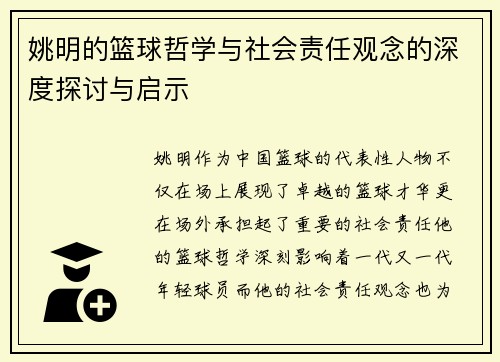 本文将深入探讨著名媒体人白岩松对姚明的篮球生涯及其社会影响力的独特视角。姚明作为中国篮球的标志性人物,其职业生涯不仅仅局限于场上的表现,还延伸至文化、社会以及国际交流等多个层面。白岩松通过其独到的观察,揭示了姚明在推动中国篮球发展、促进中美文化交流和参与公益事业等方面的重要贡献。文章将从姚明的职业成就、社会责任感、国际形象塑造以及对年轻球员的激励作用四个方面进行详细分析,以展现姚明作为一个运动员及...